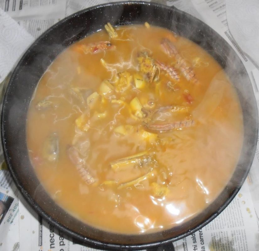 A mitad cocción, añádele el rape, 5 minutos más tarde, las gambas, galeras y la picada.